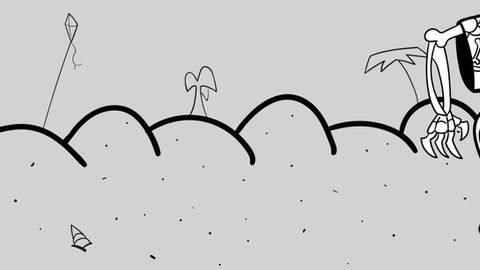 When developing this series, I started with a base pose I pulled from my own photographic reference, and tested a number of directions and illustration styles, and used peer review to narrow my focus to the beach skeleton theme. I then expanded on that theme with more poses and characters, and by delving into other mediums like animation. The initial development for this project was done in marker, and I tried to keep that look with the bold thick outlines and geometric shapes of the design. I used the skeleton character to tie the series together, as we follow his head bouncing around the different scenes.